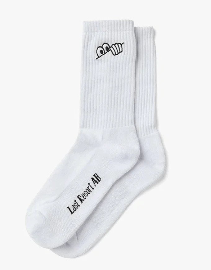 An everyday essential customized with Last Resort AB artwork, these black Eyes Socks have been made from a soft blend of cotton, polyester, and spandex which offers a combination of durability and style during everyday wear. Cut to sit at crew length, ribbing around the ankle helps to keep the fit in place when active whilst an embroidered logo design on either side shows cartoon eyes and a hand peeking over a surface. Along the edge of the forefoot an additional graphic shows ‘Last Resort AB’ lettering for distinctive branding.