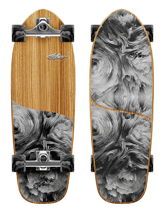 Key Features: Exotic Zebra Veneer with Canadian Maple Deck, 6.5” Reverse King Pin Surf truck front, 6.5” Standard truck back, 3mm riser pads, 65mm 78a wheels, Abec 7 chrome bearings, Printed deck grip, Length 31” x width 10”.